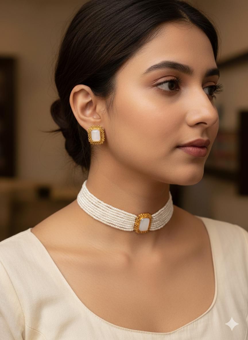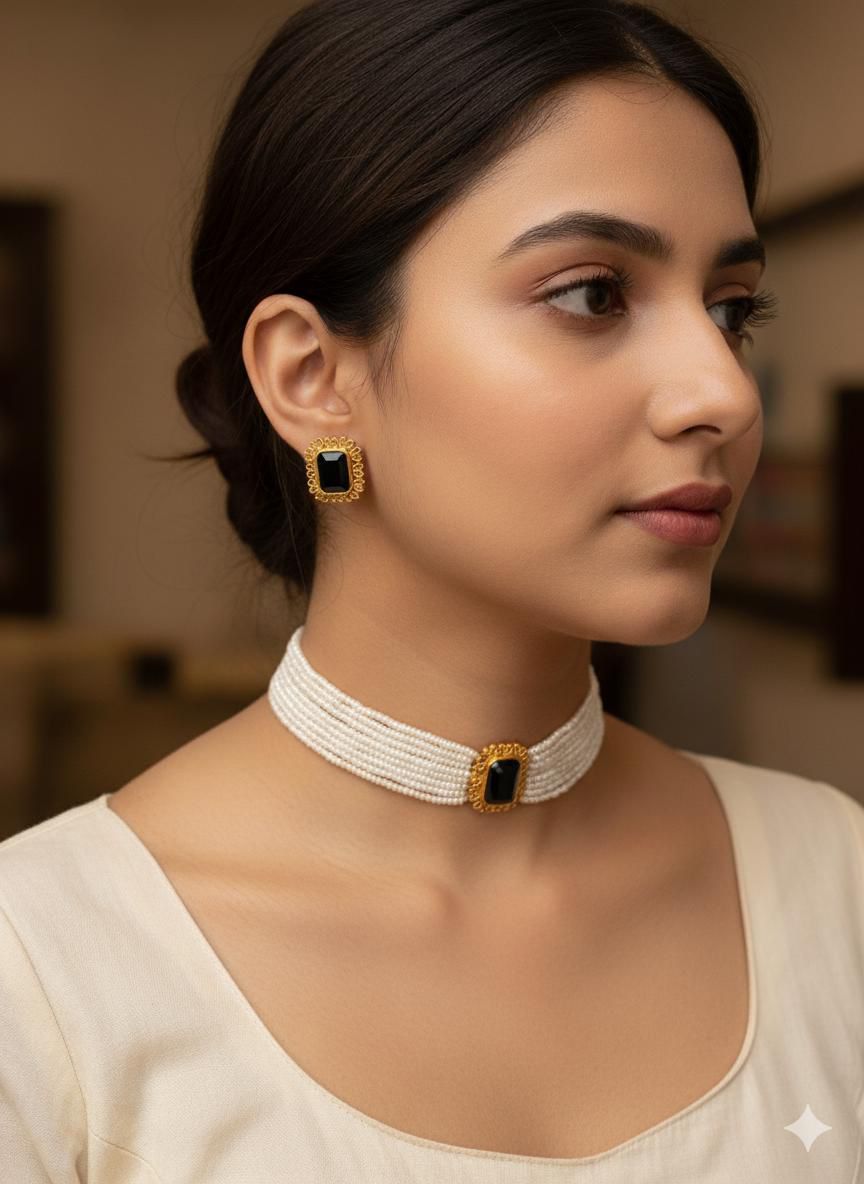The Colouful stone Pearl cluster Chooker is a stylish accessory that adds a pop of color and elegance to any outfit. With its eye-catching combination of colorful stones and pearls, this choker is sure to make a statement. Made with high-quality materials, it is a durable and chic addition to your jewelry collection.